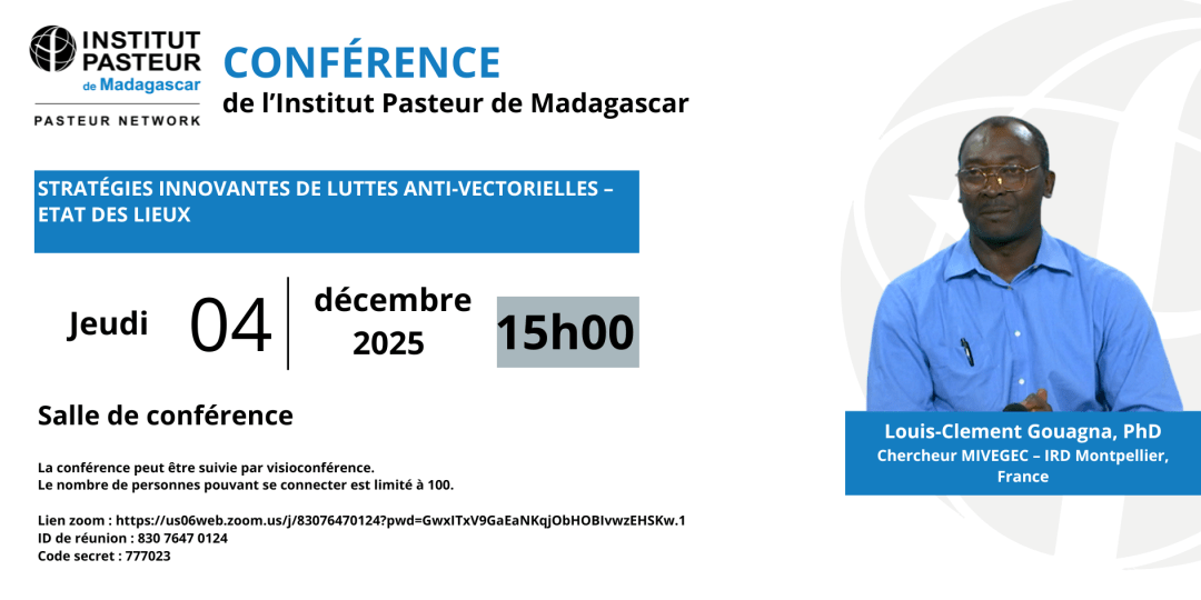 L’Institut Pasteur de Madagascar organise une conférence intitulée «Stratégies innovantes de luttes anti-vectorielles – état des lieux» le jeudi 4 décembre 2025 à 15h, en salle de conférence.
