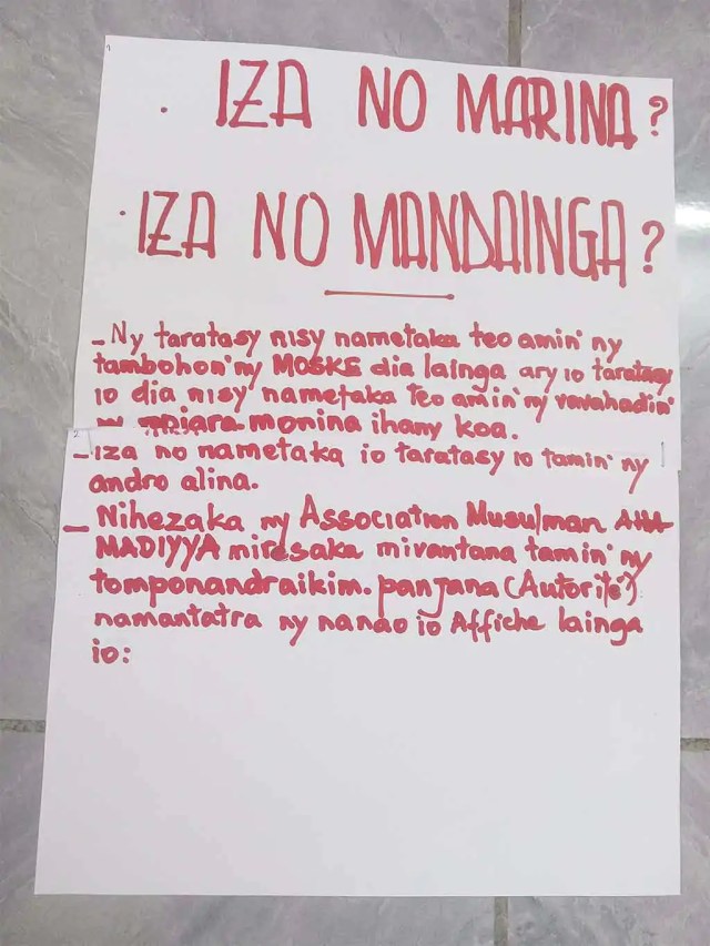 “Iza no marina? Iza no mandainga? Ny taratasy nisy nametaka teo amin’ny tambohon’ny “Mosquée” dia lainga ary io taratasy io dia nisy nametaka teo amin’ny vavahadin’ny mpiara-monina ihany koa. Iza no nametaka io taratasy io tamin’ny andro alina?”. Niezaka ny “Association Musulman Ahamadiyya” niresaka tamin’ny tompon’andraiki-panjakana namantatra ny nanao io affiche” lainga io.” Ireo no fanontaniana napetraky ny “Association Musulman Ahamadiyya” eny amin’ny fokontany Tongarivo Tanjombato nanoloana ny tranga niseho teny an-toerana. Niezaka namaly ny fanasoketana azy ireo tamin’ny fanaparitahana vaovao diso ihany koa ny fikambanana. Vaovao diso izay nahatonga disadisa teo amin’ny fikambanana sy ny mponina eny amin’ity fokontany ity. Ny talata 30 desambra 2025 no nitondra ny fanazavana, teny amin’ny “Mosquée” Tongarivo Tanjombato, ireo tompon’andraikitra ao amin’ny fikambanana. Nanambara araka izany ny fikambanana fa tsy avy amin’izy ireo ny fanasoketana fa izy ireo aza no iharan’ny antsonjay maro samihafa. Tsy manao herisetra amin’ny mponina eny amin’ny fokontany Tongarivo Tanjombato ihany ny fikambanana, araka ny fanazavana voaray.
