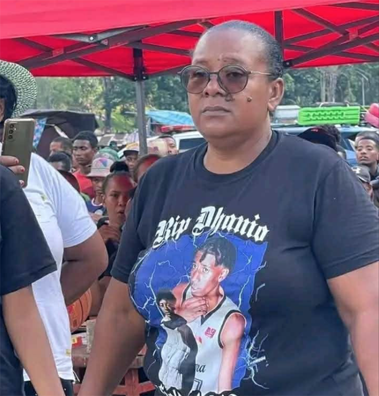 | Aurélia Razanamahasoa, le regard voilé par la douleur, arbore le portrait de son fils Dhanio, tué en 2024, imprimé sur son tee-shirt. |